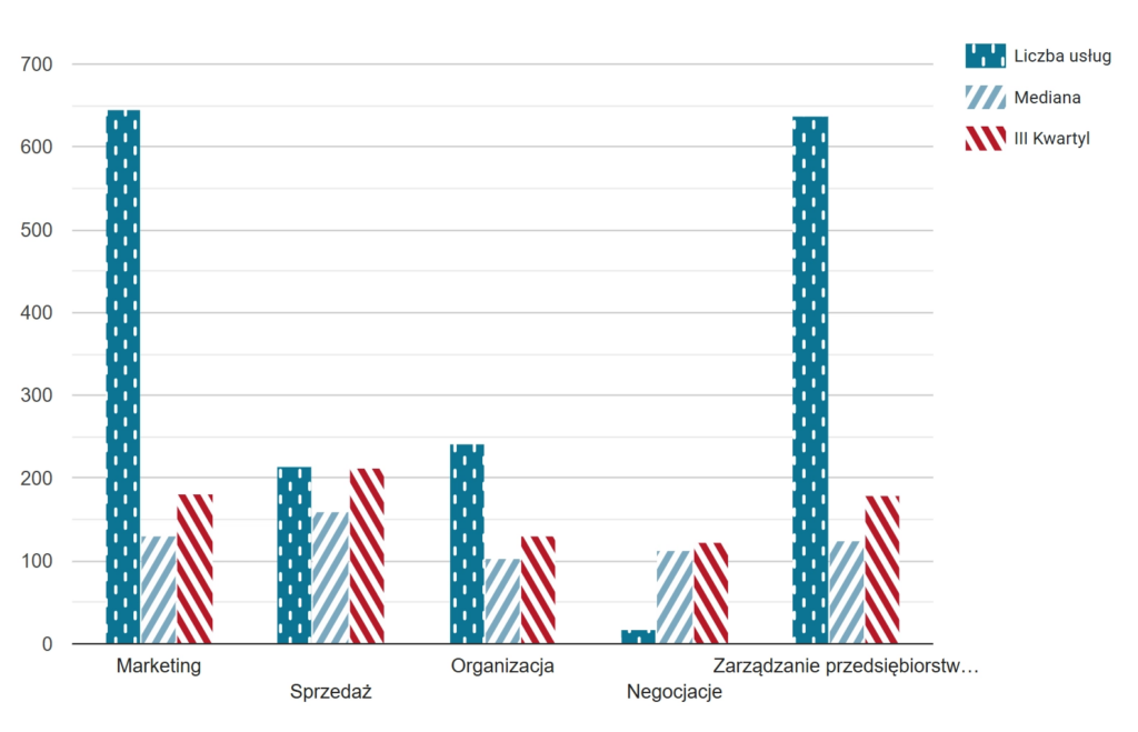 Przeanalizowaliśmy dane z Bazy Usług Rozwojowych – setki ofert szkoleniowych w kategorii Biznes (i w kilku innych dla porównania i jako ciekawostki). Oto co znaleźliśmy.