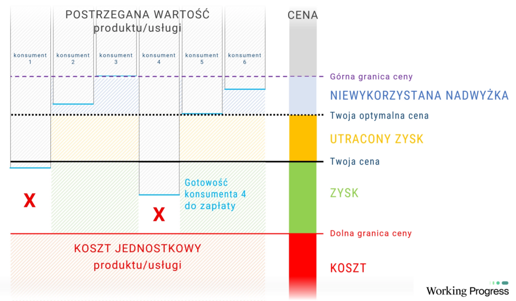 Wracając do diagramu: wyobraź sobie, że słupki konsumentów 1 i 4 rosną – bo lepiej zrozumieli wartość, która stoi za produktem. Konsument 4 nagle „mieści się” powyżej linii ceny i kupuje. A konsumenci 2, 3, 5 i 6? Ich słupki też rosną. Jeśli nie podniesiesz ceny, będą mieli poczucie wygranej z transakcji. Ale większą gotowość do zapłaty to też dodatkowa przestrzeń na podniesienie ceny w przyszłości.